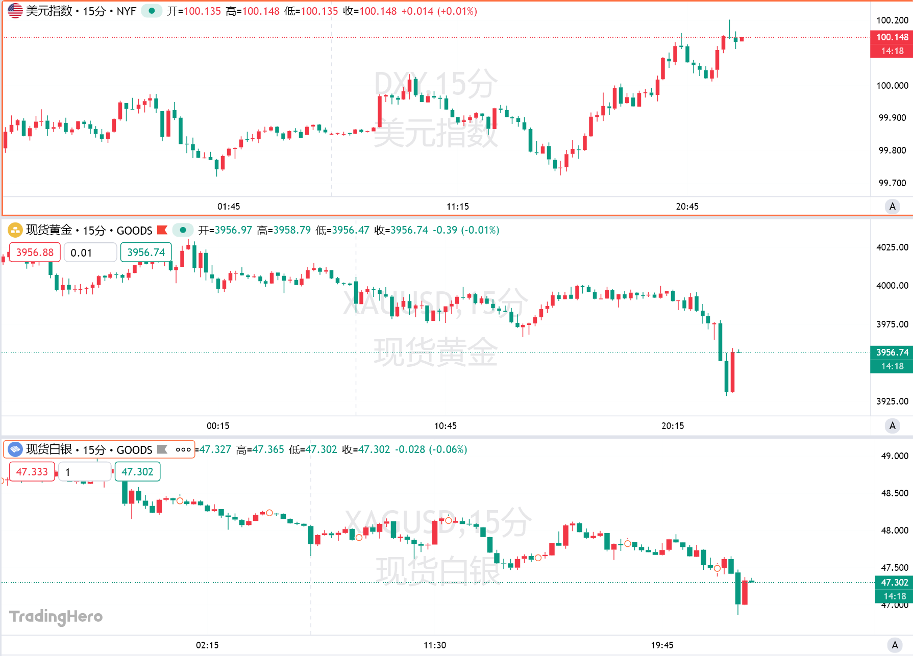 周二,美元指数站上100关口,创三个月新高。同时国际现货黄金下跌,美盘跌势加速,一度失守3930美元/盎司,随后迅速反弹,截止发稿重回3950美元/ 盎司上方。现货白银日内跌幅一度达2%,逼近47美元/盎司,截止发稿跌幅也有所收窄。 StoneX分析师罗娜·奥康奈尔(Rhona O'Connell)在报告中表示,"黄金正褪去部分泡沫,但仍在反映对美联储独立性的担忧、滞胀可能性,以及潜在的地缘 政治风险与国际紧张局势。此次回调十分必要,已挤出部分泡沫。" 此外,中国黄金税收新政的实际执行细则尚不明确,部分分析师认为这可能令黄金需求前景蒙上阴影。 与此同时,美联储官员的表态显示,对于如何应对当前的数据缺口,他们存在不同观点。 美联储理事库克表示,她认为劳动力市场进一步走弱的风险大于通胀回升风险,但未承诺12月会支持再次降息。这番表态与另外两位同僚 ——旧金山联储 主席戴利和芝加哥联储主席古尔斯比的观点一致。相反,美联储理事米兰则称,当前货币政策仍处于限制性区间,他将继续倡导大幅降息。 上月中旬,黄金曾创下历史新高,但随后因市场担忧其涨势过快而出现回调。今年以来已累计上涨53%的黄金,自10月20日触及历史高点后, ...