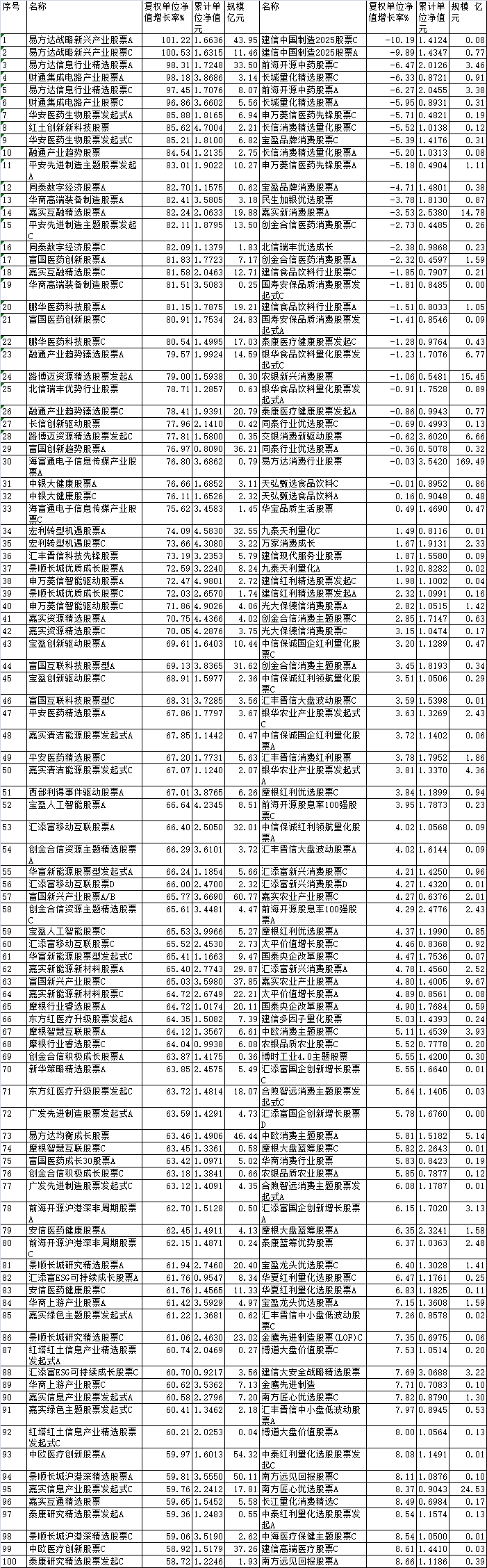Group 1 - In the first ten months of the year, 943 out of 974 comparable ordinary equity funds achieved positive performance, representing a 97% success rate, with only 31 funds declining [1][3] - The top-performing funds include E Fund Strategic Emerging Industries Stock A and C, with returns of 101.22% and 100.53% respectively, benefiting from the surge in sectors like semiconductors and computing [1][2] - The E Fund Information Industry Selected Stock A and C, managed by veteran Zheng Xi, also performed well, with increases of 98.31% and 97.45%, focusing on semiconductor stocks [2][3] Group 2 - The healthcare-themed funds, such as Huaan Pharmaceutical Biotechnology Stock A and C, saw significant gains of 85.88% and 85.21%, respectively, indicating strong performance in the pharmaceutical sector [3][4] - Despite the overall market rise, only 31 ordinary equity funds reported negative returns, with the largest decline being less than 7% for funds heavily invested in traditional sectors like medicine and liquor [3][4] - The Baoying Brand Consumption Stock A and C experienced declines of 4.71% and 5.39%, attributed to a shift in management and a focus on consumer stocks [4][5] Group 3 - The data from Tonghuashun indicates that the performance of various funds is closely tied to their sector focus, with technology and healthcare leading the gains [1][3] - The report highlights the importance of fund management experience, as seen with managers like Zheng Xi and Ouyang Liangqi, who have extensive backgrounds in industry research [2][3] - The overall trend in the A-share market suggests a strong recovery, with a majority of funds benefiting from sector-specific booms, particularly in technology and healthcare [1][3]