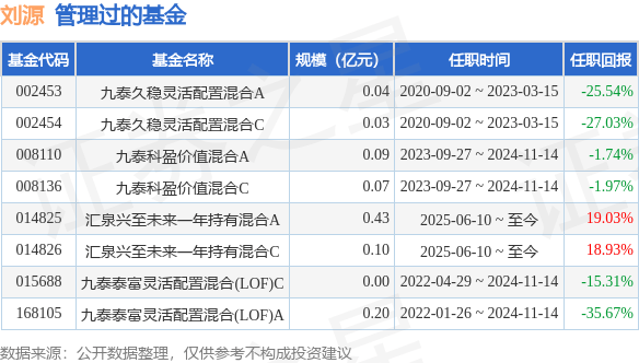 | 基金代码 | 基金名称 | 规模(亿元) | 任职时间 | 任职回报 | | --- | --- | --- | --- | --- | | 002453 | 九泰久稳灵活配置混合A | 0.04 | 2020-09-02 ~ 2023-03-15 | -25.54% | | 002454 | 九泰久稳灵活配置混合C | 0.03 | 2020-09-02 ~ 2023-03-15 | -27.03% | | 008110 | 九泰科盈价值混合A | 0.09 | 2023-09-27 ~ 2024-11-14 | -1.74% | | 008136 | 九泰科盈价值混合C | 0.07 | 2023-09-27 ~ 2024-11-14 | -1.97% | | 014825 | 汇泉兴至未来一年持有混合A | 0.43 | 2025-06-10 ~ 至今 | 19.03% | | 014826 | 汇泉兴至未来一年持有混合C | 0.10 | 2025-06-10 ~ 至今 | 18.93% | | 015688 | 九泰泰富灵活配置混合(LOF)C | 0.00 | 2022-04-29 ~ 202 ...