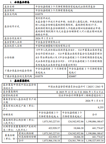 中金恒嘉稳健3个月持有期债券成立 规模11.98亿元
