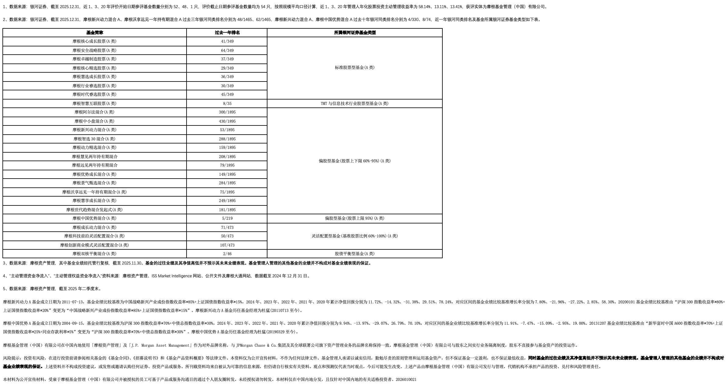 2025年,A股市场在结构性行情中持续演绎,主动权益类基金凭借优秀的选股与配置能力,整体实现了显著的超额收益。 Wind数据显示,截至2025年12月底,万得偏股混合型基金指数年度涨幅为33.19%,显著跑赢沪深300指数(年度涨幅17.66%)、中证800指数(年度涨幅 20.89%),凸显了在复杂市场环境中主动管理的价值。 在这其中,深耕中国市场逾二十载的摩根基金,交出了一份尤为亮眼的成绩单。 根据银河证券数据,截至2025年底,摩根基金近一年、近三年及近二十年的主动股票投资管理能力均稳居行业前十(排名分别为9/130、9/124、8/31),近 一年股票投资主动管理收益率达58.14%1,25只主动权益基金2025年业绩排名同类前1/4,展现了持续且强劲的主动管理能力2。 具体产品方面,过去一年,摩根双核平衡混合A、摩根中国优势混合A分别位列同类第2与第5。拉长周期看,过去三年,摩根新兴动力混合A、摩根沃享远 见一年持有期混合A等跻身同类前5%;过去十年,摩根新兴动力混合A、摩根中国优势混合A更是分别高居同类第4与第8位2。 总体来看,摩根基金中国权益投资团队整体看好多条主线:科技成长方面,AI产业趋势 ...