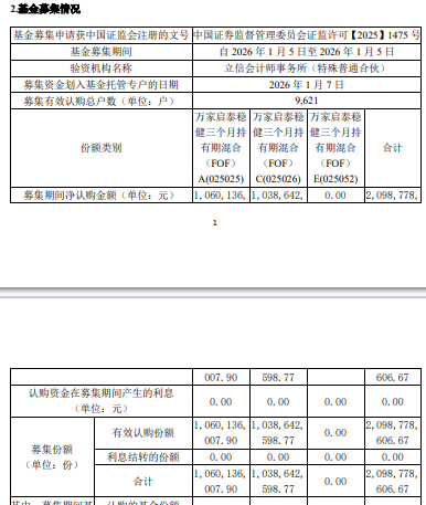 中国经济网北京1月9日讯昨日,万家基金发布万家启泰稳健三个月持有期混合型基金中基金(FOF)基金 合同生效公告。 募集期间净认购金额2,098,778,606.67元,认购资金在募集期间产生的利息0元,募集份额合计 2,098,778,606.67份。 该基金拟任基金经理为任峥和贺嘉仪。任峥曾任海通证券股份有限公司客户资产管理部专务,汇添富基 金管理有限公司投资理财总部高级经理,光大证券股份有限公司资产管理总部投资经理、执行董事,平 安资产管理有限责任公司基金投资部投资团队负责人、执行总经理等职。2023年8月入职万家基金管理 有限公司,现任万家基金管理有限公司总经理助理、基金经理。 | | | 007. 90 | 598, 77 | | 606, 67 | | --- | --- | --- | --- | --- | --- | | 认购资金在募集期间产生的利息 (单位:元) | | 0. 00 | 0. 00 | 0. 00 | 0.00 | | 募集份额 | 有效认购份额 | 1,060,136, 1,038,642, 007.90 | 598. 77 | 0.00 | 2.098.778. 606. ...