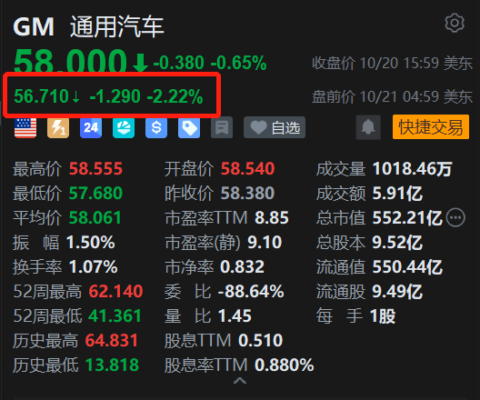| GM 通用汽车 | | | | --- | --- | --- | | 58 000 4 -0.380 -0.65% | | 收盘价 10/20 15:59 美东 | | 56.710 ↓ -1.290 -2.22% | | 盘前价 10/21 04:59 美东 | | 三五四号 5 日 中 品 | | ● 快捷交易 | | 最高价 58.555 | 开盘价 58.540 | 成交量 1018.46万 | | 最低价 57.680 | 昨收价 58.380 | 成交额 5.91亿 | | 平均价 58.061 | 市盈率TIM 8.85 | 总市值 552.21亿 … | | 振 幅 1.50% | 市盈率(静) 9.10 | 总股本 9.52亿 | | 换手率 1.07% | 市净率 0.832 | 流通值 550.44亿 | | 52周最高 62.140 | 委 - 88.64% | 流通股 9.49亿 | | 52周最低 41.361 | 量 比 1.45 | 每 手 1股 | | 历史最高 64.831 | 股息TTM 0.510 | | | 历史最低 13.818 | 股息率TTM 0.880% ...