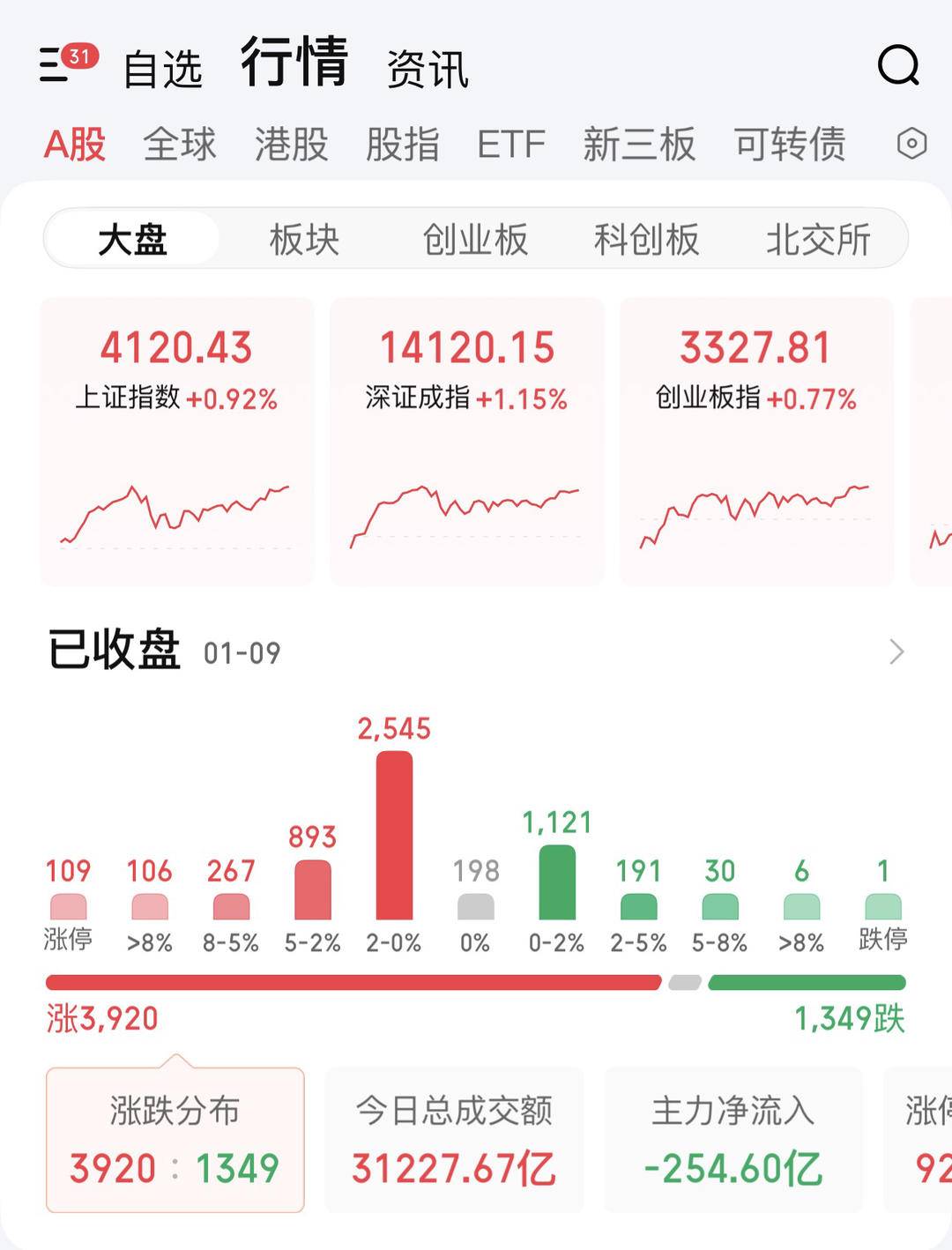 从板块来看,AI应用概念集体爆发,二十余只成分股涨停,引力传媒(603598)5天4板,省广集团(002400)、会畅科技(300578)、粤传媒 (002181)、易点天下(301171)涨停。商业航天概念反复活跃,鲁信创投(600783)11天9板,中国卫通(601698)9天5板,金风科技(002202)4连 板,航天电子(600879)6天4板。可控核聚变概念延续强势,弘讯科技(603015)、中国一重(601106)双双3连板。下跌方面,脑机接口概念下挫,美 好医疗(301363)、倍益康跌超10%。截至收盘,沪指涨0.92%,深成指涨1.15%,创业板指涨0.77%。 本周,上证指数累计上涨3.82%,创出逾一年最大单周升幅;创业板指累计涨3.89%。 扬子晚报1月9日讯(记者范晓林)1月9日,沪指高开高走突破4100点,豪取16连阳,深成指涨超1%。沪深两市成交额3.12万亿,较上一个交易日放量3224 亿,时隔73个交易日后再度站上3万亿大关,为史上第5次突破3万亿。 盘面上,市场热点快速轮动,全市场超3900只个股上涨,连续2日超百股涨停,其中周五连板股总数19只,46股封板未遂,封板率为6 ...