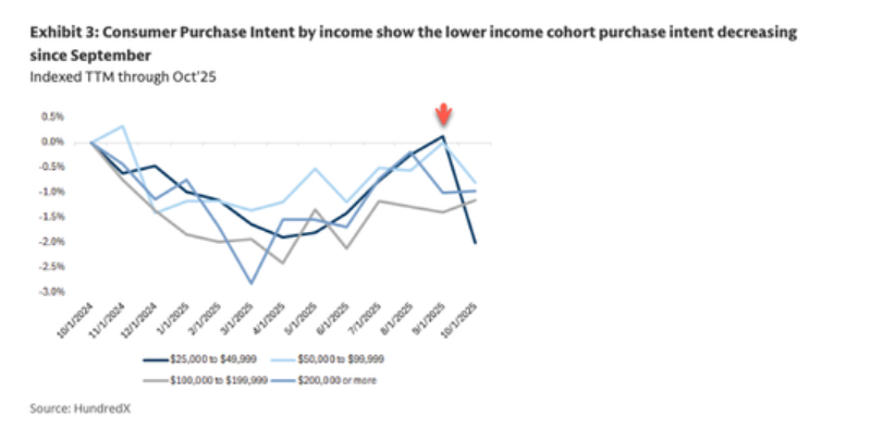 Core Insights - The spending willingness of young and low-income consumers in the U.S. is sharply declining, indicating a potential slowdown in consumer spending overall [1][4] - This trend is linked to the "student loan default cliff" and negative sentiment surrounding a potential government shutdown, which are pressuring consumers' financial situations and future expectations [4] Group 1: Consumer Spending Trends - Low-income and younger consumers, particularly Gen Z and Millennials, are showing a significant decrease in discretionary spending across various sectors including dining, apparel, beauty, home improvement, electronics, and travel [1] - The data is collected weekly from thousands of consumers to gauge spending likelihood in key areas [1] Group 2: Economic Implications - The reduction in spending willingness among these demographics could signal a broader consumption slowdown, posing challenges for the performance and stock prices of related public companies [4] - The U.S. economy heavily relies on consumer spending, making this trend a critical early warning for investors [4] Group 3: Government Policy Impact - In the context of low consumer sentiment, President Trump announced a plan suggesting that every American would receive a $2,000 "dividend" from tariffs, excluding high-income individuals [5] - The estimated cost of this "tariff refund" plan is projected to reach $600 billion, significantly exceeding the expected tariff revenue of approximately $300 billion, raising concerns among economists about potential inflation [5]