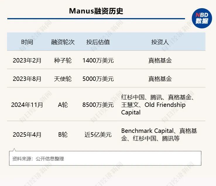 | | | Manus融资历史 | | | --- | --- | --- | --- | | 时间 | 融资轮次 | 投后估值 | 投资人 | | 2023年2月 | 种子轮 | 1400万美元 | 真格基金 | | 2023年8月 | 天使轮 | 5000万美元 | 真格基金 | | 2024年11月 | A轮 | 8500万美元 | 红杉中国、腾讯、真格基金、 王慧文、Old Friendship Capital | | 2025年4月 | B轮 | 近5亿美元 | Benchmark Capital、真格基 金、红杉中国、腾讯等 | | 资料来源:公开信息整理 | | | | Manus源自中国创始团队,其核心产品是一款能自主执行研究、编码等复杂任务的"AI智能体"。自今年3月发布以来,Manus在不到10个月的时间里迅速崛 起,于12月17日宣布其年度经常性收入(ARR)已突破1亿美元,成为AI应用领域的"现象级"产品。其估值从种子轮后的1400万美元到超20亿美元,不到3 年的时间增长逾142倍。 12月30日,Meta抛出年度AI布局收官:宣布完成对AI初创公司Manus的收购。这场由CEO扎克 ...