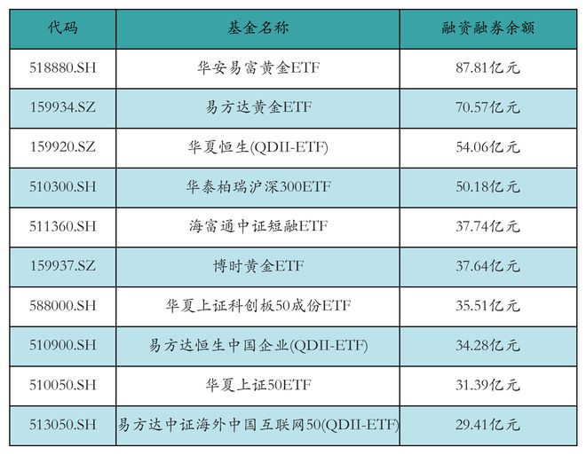 市场概况 4月29日两市ETF两融余额为1030.92亿元,较前一交易日增加5.07亿元。其中融资余额为983.37亿元, 较前一交易日增加5.1亿元;融券余额为47.55亿元,较前一交易日减少386.58万元。 分市场来看,沪市ETF两融余额为679.48亿元,较前一交易日增加5.11亿元。其中融资余额为638.82亿 元,较前一交易日增加5.15亿元;融券余额为40.67亿元,较前一交易日减少379.25万元。深市ETF两融 余额为351.44亿元,较前一交易日减少453.75万元。其中融资余额为344.55亿元,较前一交易日减少 446.43万元;融券余额为6.89亿元,较前一交易日减少7.32万元。 ETF融资融券余额 4月29日ETF两融余额前三位分别为:华安易富黄金ETF(87.81亿元)、易方达黄金ETF(70.57亿元)和华夏 恒生(QDII-ETF)(54.06亿元),前10具体见下表: | 代码 | 基金名称 | 融资融券余额 | | --- | --- | --- | | 518880.SH | 华安易富黄金ETF | 87.81亿元 | | 159934.SZ | 易方达黄金ETF | ...