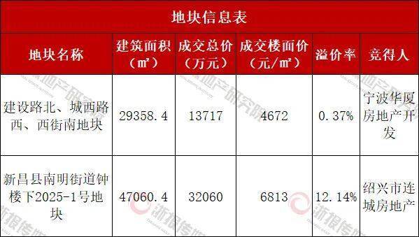 潮新闻客户端 记者 丰方旭 今日,宁波和绍兴成功出让2宗涉宅地,分别位于宁波象山和绍兴新昌。 地块位于新昌核心城区,周边拥有非常醇熟的生活配套,东面即为商业综合体世贸广场,距离新昌县政府、新 昌人民医院约300米,南明小学、实验小学、实验中学等优质教育配套环伺周边。 图 | 地块区位图(来源:决策通) 竞价超300轮 绍兴连城加仓新昌 新昌县南明街道钟楼下2025-1号地块出让面积39217㎡,容积率1.2,可建面积47060.4㎡。地块经历7小时的鏖 战,竞价轮次超300轮,最终由绍兴市连城房地产以32060万元总价竞得,成交楼面价为6813元/㎡,溢价率 12.14%。 地块周边在售项目主要为岙桥里、金泰·里江府等,待售项目主要分布在板块的东侧和西北侧。其中岙桥里也是 由绍兴市连城房地产于2021年11月以成交楼面价8331元/㎡竞得的项目,所以此次也是其再度加仓。 宁波华厦房地产开发竞得象山老城区地块 建设路北、城西路西、西街南地块出让面积27848㎡,综合容积率1.054,可建面积29358.44㎡。地块最终由宁 波华厦房地产开发以13717万元总价竞得,成交楼面价为4672元/㎡,溢价率0.37%。 ...