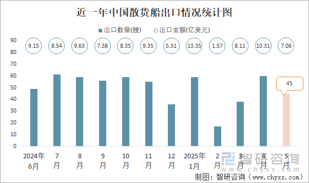 2025年5月中国散货船出口数量和出口金额分别为45艘和7.06亿美元
