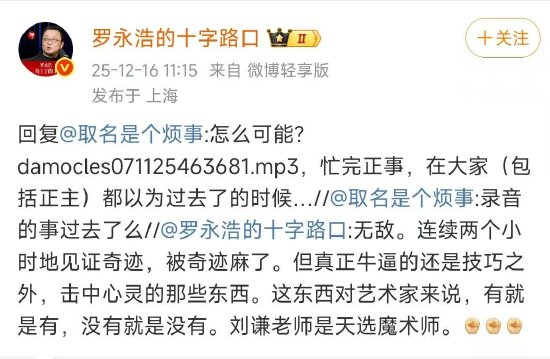 责任编辑:江钰涵 12月16日,有网友向罗永浩询问:"录音的事过去了么?" 随后,罗永浩晒出疑似录音的文件名回应:"怎么可能damocles071125463681.mp3,忙完正事,在大家 (包括正主)都以为过去了的时候…" 此前,罗永浩与华杉再起冲突。11月25日,华杉在微博发文称,"西贝是中国餐饮业的天花板,无论对 顾客还是对员工,都是诚心诚意做到极致。被诱入黑白颠倒的网络罗刹国,被人算计。西贝坚持自己的 华夏子弟精神,不苟且偷生,凭仁义立世。" 其后,罗永浩迅速向华杉"开炮",并发文表示,"谁诱的?谁算计了?你想干什么?你要是说不清楚, 我就公布录音了。" 紧接着,罗永浩发出"最后通牒":"西贝正在整改,这次跟西贝无关,这次是我和华杉之间的事。华杉 这次再跟我私下道歉已经不管用了,必须公开道歉。今天下午六点之前,如果华杉没有在微博公开道 歉,未来中国的市场公关行业应该不会有人再记得华与华了,只记得罗与华。" 截至目前,罗永浩仍未公布录音。 其后,罗永浩迅速向华杉"开炮",并发文表示,"谁诱的?谁算计了?你想干什么?你要是说不清楚, 我就公布录音了。" 紧接着,罗永浩发出"最后通牒":"西贝正在整改,这 ...