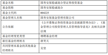 Group 1 - The core point of the news is the appointment of Tang Xiaotian as a new fund manager for the Guoshou Anbao Stable Mixed Fund, effective from March 2024 [1][2] - Tang Xiaotian has a diverse background in financial analysis and fund management, having previously worked at various financial institutions including China International Capital Corporation and Tianfeng Securities [1] - The Guoshou Anbao Stable Mixed Fund was established on January 20, 2017, and has reported a year-to-date return of 1.03% and 0.99% for its two share classes as of June 12, 2025, with cumulative returns since inception of 51.67% and 50.44% respectively [1] Group 2 - The fund is managed by Guoshou Anbao Fund Management Co., Ltd., and the announcement was made in accordance with relevant regulations regarding public offering securities investment funds [2] - The fund manager change is classified as an additional appointment, with Wu Jian continuing to co-manage the fund alongside Tang Xiaotian [2]