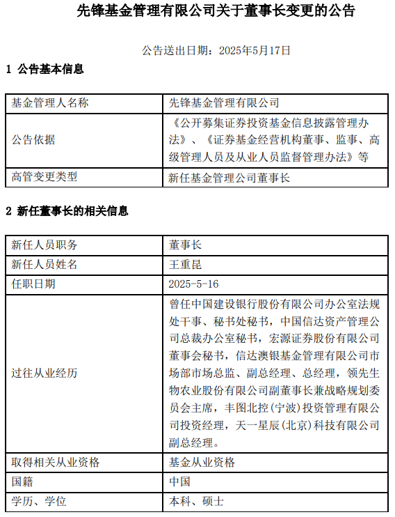 中国经济网北京5月19日讯 近日,先锋基金管理有限公司公告称,王重昆任公司董事长。 | 新任人员职务 | 重事长 | | --- | --- | | 新任人员姓名 | 王重昆 | | 任职日期 | 2025-5-16 | | 过往从业经历 | 曾任中国建设银行股份有限公司办公室法规 | | | 处干事、秘书处秘书,中国信达资产管理公 | | | 司总裁办公室秘书,宏源证券股份有限公司 | | | 董事会秘书,信达澳银基金管理有限公司市 | | | 场部市场总监、副总经理、总经理,领先生 | | | 物农业股份有限公司副董事长兼战略规划委 | | | 员会主席,丰图北控(宁波)投资管理有限公 | | | 司投资经理,天一星辰(北京)科技有限公司 | | | 副总经理。 | | 取得相关从业资格 | 基金从业资格 | | 国籍 | 中国 | | 学历、学位 | 本科、硕士 | 王重昆曾任中国建设银行股份有限公司办公室法规处干事、秘书处秘书,中国信达资产管理公司总 裁办公室秘书,宏源证券股份有限公司董事会秘书,信达澳银基金管理有限公司市场部市场总监、副总 经理、总经理,领先生物农业股份有限公司副董事长兼战略规划委员 ...