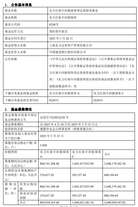 中国经济网北京5月27日讯 今日,上海东方证券资产管理有限公司发布东方红裕丰回报债券型证券 投资基金基金合同生效公告。 (责任编辑:李荣) 该基金募集期间净认购金额合计2,648,179,362.38元,认购资金在募集期间产生的利息合计 860,184.64元,募集份额合计2,649,039,547.02份。 | 基金募集申请获中国证 | | 证监许可[2025]338号 | | | | --- | --- | --- | --- | --- | | 监会核准的文号 | | | | | | 重令变革湖回 | | 自2025年4月28日至2025年5月21日止 | | | | 验资机构名称 | | 德勤华永会计师事务所(特殊普通合伙) | | | | 募集资金划入基金托管 | | 2025年5月23日 | | | | 专户的日期 | | | | | | 募集有效认购总户数(单 | 5,928 | | | | | 位:户) | | | | | | 份额类别 | | 东方红裕丰回报债券 | 东方红裕丰回报债券 | 合计 | | | A | | C | | | 募集期间净认购金额(单 | | 804,741,508. ...