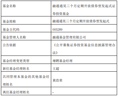 中国经济网北京5月21日讯 今日,融通基金公告,融通通昊三个月定期开放债券型发起式增聘王 超。 | 基金名称 | 融通過吴三个月定期开放债券型发起式证 | | --- | --- | | | 券投资基金 | | 基金简称 | 融通過吴三个月定期开放债券型发起式 | | 基金主代码 | 005289 | | 基金管理人名称 | 融通基金管理有限公司 | | 公告依据 | 《公开募集证券投资基金信息披露管理办 法》 | | 基金经理变更类型 | 增聘基金经理 | | 新任基金经理姓名 | 王超 | | 共同管理本基金的其他基金经 | 黄浩荣 | | 理姓名 | | | 离任基金经理姓名 | . | (责任编辑:康博) 王超2007年7月至2012年8月就职于平安银行金融市场产品部从事债券投资研究工作。2012年8月加 入融通基金管理有限公司,历任投资经理、固定收益部总监、基金经理。 融通通昊三个月定开债成立于2018年4月17日,截至2025年5月20日,其今年来收益率为0.52%,成 立来收益率为34.48%,累计净值为1.3024元。 ...