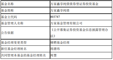 Group 1 - The core point of the news is the appointment of Zhou Qianwei as an additional fund manager for the Wanjia Xinxing Pure Bond Fund by Wanjia Fund Management Co., Ltd [1] - Zhou Qianwei has a background in the financial market, having previously worked as a bond trader and deputy head of the fixed income department at Shanghai Bank [1] - The Wanjia Xinxing Pure Bond Fund was established on February 9, 2017, and as of June 6, 2025, it has achieved a year-to-date return of 0.71% and a cumulative return since inception of 34.60% [1] Group 2 - The fund is classified as a bond-type securities investment fund, with the main code 003747 [2] - The announcement of the fund manager change is based on the "Publicly Raised Securities Investment Fund Information Disclosure Management Measures" [2] - Zhou Qianwei will be managing the fund alongside the existing fund manager, Zhou Hui [2]