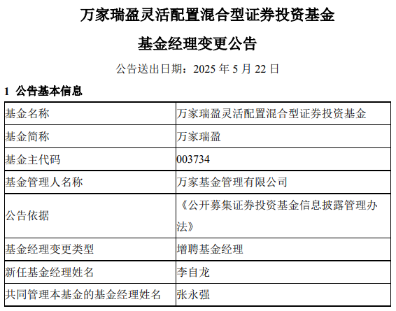 中国经济网北京5月22日讯 今日,万家基金管理有限公司公告称,万家瑞盈灵活配置混合(A类 003734;C类003735)增聘李自龙。 李自龙曾任通联数据股份公司金融工程部量化研究员,上海鹤骑鹰投资管理有限公司投资研究部量 化研究员,东兴期货有限责任公司投资咨询部研究员等职。2020年4月入职万家基金管理有限公司,现 任量化投资部基金经理,历任量化投资部投资经理助理、投资经理。 万家瑞盈灵活配置混合A、C成立于2016年11月11日,截至2025年5月21日,其今年来收益率 为-0.38%、-0.46%,成立来收益率为25.86%、25.06%,累计净值为1.2587元、1.2507元。 | 公告基本信息 | | --- | | 基金名称 | 万家瑞盈灵活配置混合型证券投资基金 | | --- | --- | | 基金简称 | 万家瑞盈 | | 基金主代码 | 003734 | | 基金管理人名称 | 万家基金管理有限公司 | | 公告依据 | 《公开募集证券投资基金信息披露管理办 | | | 法》 | | 基金经理变更类型 | 增聘基金经理 | | 新任基金经理姓名 | 李自龙 | | 共同管理本基金的基金 ...