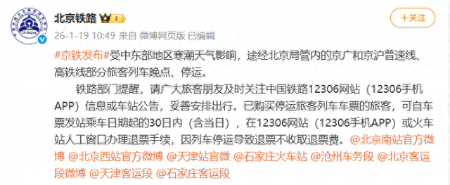据@北京铁路 消息,受中东部地区寒潮天气影响,途经北京局管内的京广和京沪普速线、高铁线部分 旅客列车晚点、停运。铁路部门提醒,请广大旅客朋友及时关注中国铁路12306网站(12306手机APP) 信息或车站公告,妥善安排出行。已购买停运旅客列车车票的旅客,可自车票发站乘车日期起的30日内 (含当日),在12306网站(12306手机APP)或火车站人工窗口办理退票手续,因列车停运导致退票不 收取退票费。 ...