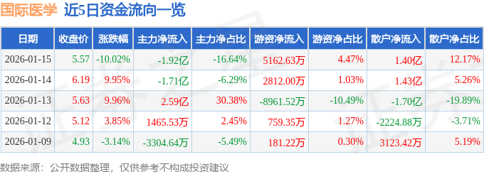 证券之星消息,截至2026年1月15日收盘,国际医学(000516)报收于5.57元,下跌10.02%,跌停,换手率 9.25%,成交量204.04万手,成交额11.54亿元。 1月15日的资金流向数据方面,主力资金净流出1.92亿元,占总成交额16.64%,游资资金净流入5162.63 万元,占总成交额4.47%,散户资金净流入1.4亿元,占总成交额12.17%。 近5日资金流向一览见下表: | 日期 收盘价 | | | | | 涨跌幅 主力净流入 主力净占比 游资净流入 游资净占比 散户净点比 | | | | | --- | --- | --- | --- | --- | --- | --- | --- | --- | | 2026-01-15 | | 5.57 -10.02% | -1.92亿 | -16.64% | 5162.63万 | 4.47% | 1.40亿 | - 12.17% | | 2026-01-14 | 6.19 | 9.95% | -1.71亿 | -6.29% | 2812.00万 | 1.03% | 1.43亿 | 5.26% | | 2026-01-13 | 5.63 | 9. ...
