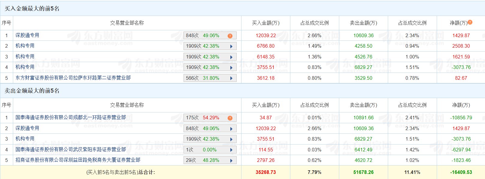 双杰电气(300444.SZ)今日涨3.64%,换手率46.79%,成交额45.29亿元。龙虎榜数据显示,深股通买入1.2亿元,卖出1.06亿元,净买入1430万元;游资"成都 系"位列卖一席位,净卖出1.09亿元。上榜席位全天买入3.53亿元,卖出5.17亿元,合计净卖出1.64亿元。(格隆汇) | 买入金额最大的前5名 | | | | | | | --- | --- | --- | --- | --- | --- | | 序号 | 交易营业部名称 | | | 买入金额(万) | 占总成交比例 | | 1 | 深股通专用 | 848次 49.06% | 2 | 12039.22 | 2.66% | | 2 | 机构专用 | 1909次 42.38% | A | 6766.80 | 1 49% | | 3 | 机构专用 | 1909次 42.38% | A | 6148.35 | 1.36% | | 4 | 机构专用 | 1909次 42.38% | A | 3755.51 | 0.83% | | 5 | 东方财富证券股份有限公司拉萨东环路第二证券营业部 | 566次 31.80% | ▲ | 3612.18 ...