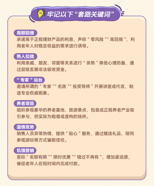 为切实提升广大群众的金融安全意识和风险防范能力,今年花瓣支付(深圳)有限公司在岁末年初期间,聚焦养 老、消费返利、高科技等领域,解析不法分子开展非法金融活动的套路手段,警示非法集资风险,相关内容以图文案 例的形式进行宣传。以下重点内容一起学习了解,帮助群众提升防非意识和能力,守住钱袋子,过好幸福年。 警惕养老领域非法集资套路 老年群体依然是防范非法金融活动重点宣传对象,养老领域的非法集资手段套路不断翻新,极具欺骗性,常见 以"养老服务项目"为噱头,承诺高息保本回报,骗取老年人的养老钱。老年人应牢记以下"套路关键词",增强防范意 识,遇事多与子女沟通。 警惕消费返利非法集资陷阱 随着互联网的发展,电商网购已深入群众生活。部分不法分子将非法集资包装成创新电商模式,宣称时间短、投 入少、收益高,诱骗消费者参与。此类非法集资模式依托于网络,具有传播面广、诱惑性大、形式新颖等特点,应谨 慎鉴别骗局手法套路,以免被"收割"。 此外,近年来,一些不法分子利用"新概念""新场景"设置骗局,编造包装所谓的"高科技"投资项目,虚假宣传高额 收益并吸收公众资金,严重侵害群众财产安全。提醒广大消费者要树立正确的投资观念,不要安装下载 ...