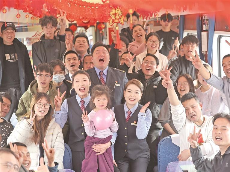 春运首日,往返京沪的G8、G10等列车上,乘务员提前为每位旅客备好新春福袋,内含马年红包、福 字、窗花、年历,小小福袋承载满满心意。据统计,春运首日长三角区域文化活动超百场,成为返乡路 上最亮眼的风景线。 上海虹桥站民乐快闪活动 ◎记者 宋薇萍 2月2日,2026年春运大幕正式拉开。当天,超过40万旅客从上海出发,奔赴家的方向。 上铁集团客运部工作人员告诉记者,春运期间,运力投放呈现以下特点:一是临时旅客列车开行总量较 2025年春运期间进一步增加,其中中短途直通方向夜间动车组临时旅客列车开行量明显增加;二是春运 高峰期增加沪宁杭地区去往云贵、川渝、东北、西北等长距离目的地,河南、湖南、湖北、江西等中距 离直通方向春运临时旅客列车,以及沪宁杭地区去往淮北、徐州、连云港等管内重点方向的运能供给; 三是恢复开行长三角去往青岛、福州、荆门、怀化、重庆、榆林等多个热门方向直通旅客列车;四是长 三角去往北京、天津、武汉等方向4对直通周末线高铁列车按现图满线开行,管内方向合肥去往黄山1趟 高铁列车按现图满线开行;五是用好沪苏湖高铁入沪通道能力,进一步加密上海南站旅客列车开行对 数;六是增开列车对数、列车编组规律按"一日一 ...