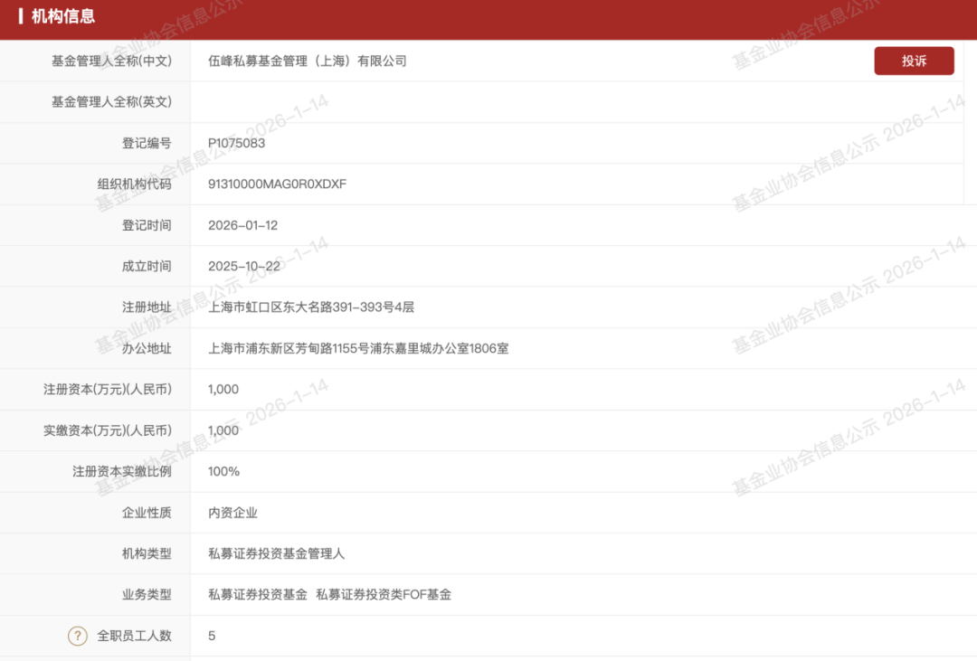 具体来看,伍峰私募成立于2025年10月22日,注册资本为1000万元,机构类型为私募证券投资基金管理人,目前有5名全职员工。 | 机构信息 | | | | --- | --- | --- | | 基金管理人全称(中文) | 伍峰私募基金管理(上海)有限公司 | 投诉 | | 基金管理人全称(英文) 登记编号 | P1075083 | 州城会信息公示 202 | | 组织机构代码 | 91310000MAG0R0XDXF | | | 登记时间 | 2026-01-12 | | | 成立时间 | 2025-10-22 | 一直筒成页 202 | | 注册地址 | 上海市虹口区东大名路391-393号4层 | | | 办公地址 | 上海市浦东新区芳甸路1155号浦东嘉里城办公室1806室 | | | 注册资本(万元)(人民币) | 1,000 2020-1- | 小物会信息少你 202 | | 实缴资本(万元)(人民币) | | | | 注册资本实缴比例 | 100% | | | 企业性质 | 内资企业 | | | 机构类型 | 私募证券投资基金管理人 | | | 业务类型 | 私募证券投资基金 私募证券投资类F ...