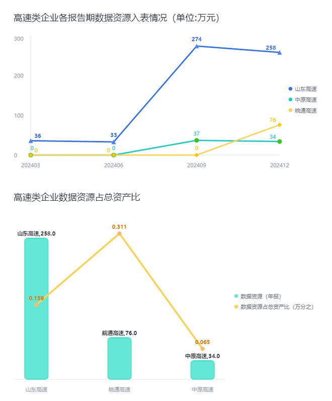 Core Insights - The highway sector has seen three companies disclose data resources in their 2024 annual reports, with a total disclosed amount of 3.68 million yuan, representing a 922% increase compared to the first quarter report [1] - Shandong Expressway leads in data resource disclosure, with an amount of 2.58 million yuan in the annual report, marking a 617% increase from the first quarter [1] - Despite Wanjun Expressway's disclosure amount being less than one-third of Shandong Expressway's, its data resources account for a significantly higher proportion of total assets [1] Company-Specific Summaries - **Shandong Expressway**: - Disclosed three self-developed data resources: road network traffic data, vehicle risk rating data, and truck unused capacity index data [2][3] - The road network traffic data is used for internal management to assist in congestion warning and diversion [3] - The vehicle risk rating data assesses safety risks based on various factors and can influence insurance premium calculations [3] - The truck unused capacity index reflects the degree of underutilization of truck transport capacity on highways [3] - **Zhongyuan Expressway**: - Completed the registration of three data products, including the "Zhongyuan Expressway Vehicle Model Database" and traffic analysis data elements [4] - Utilizes ELT data integration methods to create a specialized database from transaction data across its toll stations [4] - Aims to enhance daily management and improve operational efficiency for logistics companies [4] - **Wanjun Expressway**: - Has not disclosed detailed data asset information in its annual report, unlike Shandong and Zhongyuan Expressways [2][10]