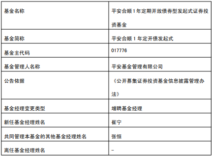 | 基金名称 | 平安合顺1年定期开放债券型发起式证券投 | | --- | --- | | | 资基金 | | 基金简称 | 平安合顺1年定开债发起式 | | 基金主代码 | 017776 | | 基金管理人名称 | 平安基金管理有限公司 | | 公告依据 | 《公开募集证券投资基金信息披露管理办 法》 | | 基金经理变更类型 | 增聘基金经理 | | 新任基金经理姓名 | 崔宁 | | 共同管理本基金的其他基金经理姓名 | 张恒 | | 离任基金经理姓名 | - | 中国经济网北京7月30日讯 今日,平安基金公告,平安合顺1年定开债发起式、平安双季鑫6个月持 有债券增聘崔宁。 崔宁曾任上海光大证券资产管理有限公司固定收益研究部研究员、固定收益公募投资部投资经理。 2024年12月加入平安基金管理有限公司,现任基金经理。 平安合顺1年定开债发起式成立于2023年2月24日,截至2025年7月29日,其今年来收益率 为-0.17%,成立来收益率为6.86%,累计净值为1.0677元。截至2025年6月30日规模20.75亿元。 平安双季鑫6个月持有债券A/C成立于2024年7月23日,截至2025年7月29 ...