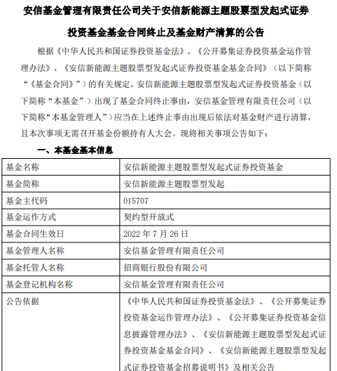 中国经济网北京7月30日讯 近日,安信基金发布关于安信新能源主题股票型发起式证券投资基金基 金合同终止及基金财产清算的公告。 | 基金名称 | 安信新能源主题股票型发起式证券投资基金 | | --- | --- | | 基金简称 | 安信新能源主题股票型发起 | | 基金主代码 | 015707 | | 基金运作方式 | 契约型开放式 | | 基金合同生效日 | 2022年7月26日 | | 基金管理人名称 | 安信基金管理有限责任公司 | | 基金托管人名称 | 招商银行股份有限公司 | | 基金登记机构名称 | 安信基金管理有限责任公司 | | 公告依据 | 《中华人民共和国证券投资基金法》、《公开募集证券 | | | 投资基金运作管理办法》、《公开募集证券投资基金信 | | | 息披露管理办法》、《安信新能源主题股票型发起式证 | | | 券投资基金基金合同》、《安信新能源主题股票型发起 | | | 式证券投资基金招募说明书》及相关公告 | 来源:公告 公告称,安信新能源主题股票型发起式证券投资基金(以下简称"本基金")截至2025年7月26日, 基金资产净值低于2亿元,已触发《基金合同》中约定的基金终 ...