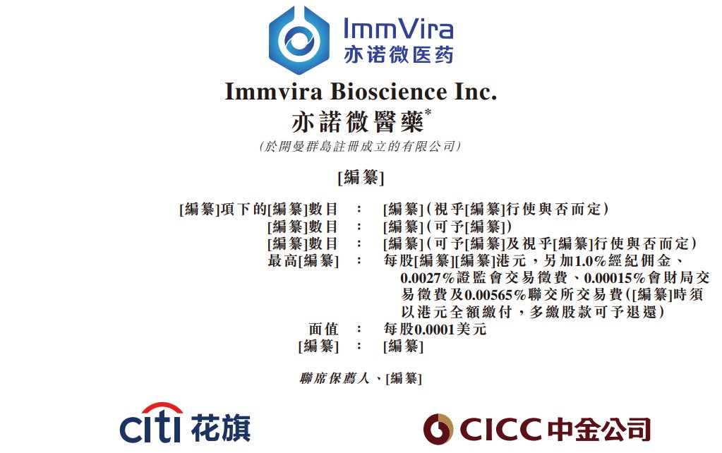 智通财经APP获悉,据港交所1月14日披露,Immvira Bioscience Inc.(简称:亦诺微医药)向港交所主板递交上市申请,花旗、中金公司为其联席保 荐人。据悉,亦诺微医药曾于2025年6月25日向港交所主板提交上市申请。招股书故露,亦诺微医药是一家专注于临床需求导向的生物科技公 司,致力于发现、开发、生产及商业化新型溶瘤免疫疗法和工程化外泌体疗法。公司已建立一条产品管线,包括:(i)两款针对实体瘤的溶瘤免疫 疗法产品,及 (ii)五款具临床应用前景或可直接商业化的工程化外泌体产品。公司自主研发的核心产品MVR-T3011是一款II期阶段的单纯庖疹病毒 1型(HSV-1)新型溶瘤免疫疗法产品,结合强效肿瘤溶解作用与抗PD-1抗体及IL-12的表达。 citi 花旗 CICC中金公司 (於開曼群島註冊成立的有限公司) [編纂] 每股[編纂][編纂]港元,另加1.0%經紀佣金、 最高[编纂] : 0.0027%證監會交易徵費、0.00015%會財局交 易 徵 費 及 0.00565 % 聯 交 所 交 易 費 ( 編 纂 ] 時 須 以港元全額繳付,多繳股款可予退還) 聯席保薦人、[編纂] ImmVi ...