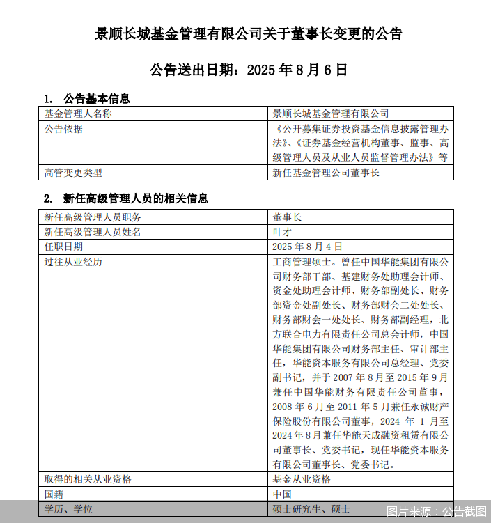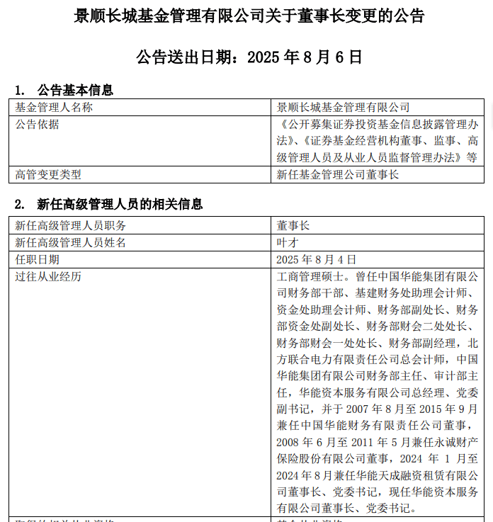 | 基金管理人名称 | 景顺长城基金管理有限公司 | | --- | --- | | 公告依据 | 《公开募集证券投资基金信息披露管理办 | | | 法》、《证券基金经营机构董事、监事、高 | | | 级管理人员及从业人员监督管理办法》等 | | 高管变更类型 | 新任基金管理公司董事长 | | 新任高级管理人员职务 | 重事长 | | --- | --- | | 新任高级管理人员姓名 | 叶才 | | 任职日期 | 2025年8月4日 | | 过往从业经历 | 工商管理硕士。曾任中国华能集团有限公 | | | 司财务部干部、基建财务处助理会计师、 | | | 资金处助理会计师、财务部副处长、财务 | | | 部资金处副处长、财务部财会二处处长、 | | | 财务部财会一处处长、财务部副经理,北 | | | 方联合电力有限责任公司总会计师,中国 | | | 华能集团有限公司财务部主任、审计部主 | | | 任,华能资本服务有限公司总经理、党委 | | | 副书记,并于 2007年8月至2015年9月 | | | 兼任中国华能财务有限责任公司董事, | | | 2008年6月至2011年5月兼任永诚财产 | | ...