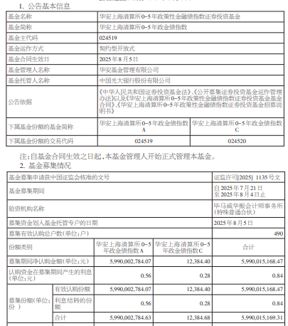 华安上海清算所0-5年政金债指数成立 规模59.9亿元