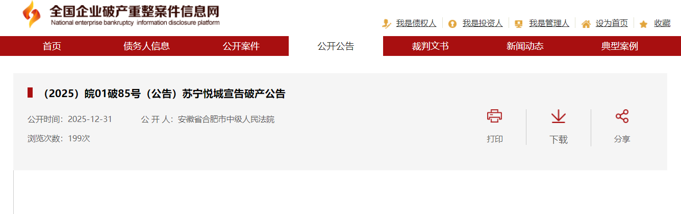 历时近10个月,合肥苏宁悦城置业有限公司(简称"合肥苏宁悦城公司")破产重整有了最终结果。 近日,据全国企业破产重整案件信息网,合肥市中级人民法院裁定,因不能清偿到期债务,且明显缺乏清偿能力,亦不具备破产重整及和解的条件,合肥苏 宁悦城公司正式破产。 公开信息显示,合肥苏宁悦城公司成立于2018年4月3日,注册资本5000万元,股东苏宁置业集团有限公司持股51%,股东安徽融创房地产开发有限公司持股 49%,公司经营范围为房地产开发、商品房销售、土地开发等业务,营业期限至2068年4月2日,登记机关为合肥市庐阳区市场监督管理局。 历时近10个月,破产案件迎来终章 回溯案件进程,2025年4月2日,应国家税务总局合肥市庐阳区税务局、徐州苏宁置业有限公司的申请,合肥中院裁定受理合肥苏宁悦城公司破产申请,并指 定国浩律师(合肥)事务所担任管理人。 2025年4月8日,苏宁置业与其他37家苏宁系公司被南京中院裁定合并重整。但因受理破产清算时间更早,合肥苏宁悦城公司被排除在合并重整范围之外。 2025年8月,管理人发布《重整投资人预招募公告》,试图引入战略投资者盘活资产,要求投资人实缴注册资本不低于6亿元。 其中,坐落于 ...