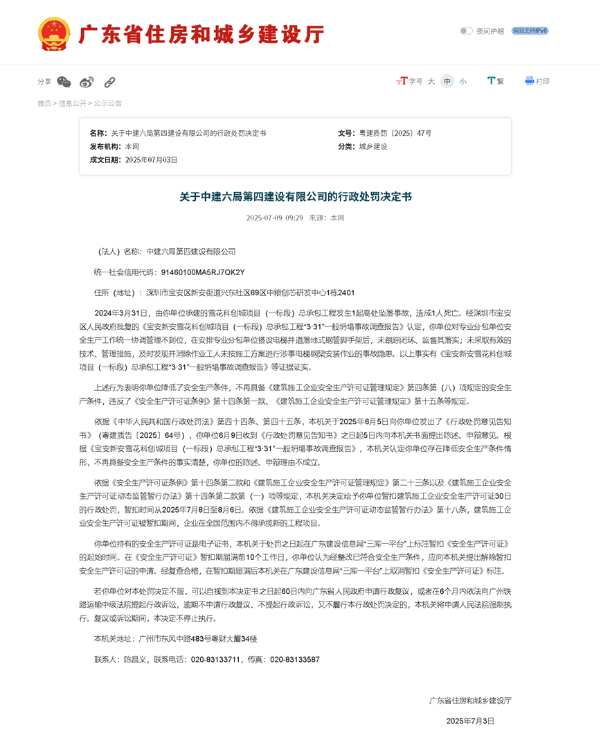 近日,广东省住房和城乡建设厅发布关于中建六局第四建设有限公司(以下简称"中建六局四公司")的行政处罚决定书。 省住房和城乡建设厅 T 字号 大 中 小 T 83 = 打印 名称:关于中建六局第四建设有限公司的行政处罚决定书 发布机构:本网 成文日期:2025年07月03日 文号:粤建质罚〔2025〕 47号 分散:城乡建设 关于中建六局第四建设有限公司的行政处罚决定书 2025-07-09 09:29 来源:本网 (法人) 名称:中建六局第四建设有限公司 统一社会信用代码:91460100MA5RJ7QK2Y 住所 (地址):深圳市宝安区新安街道兴东社区69区中粮创芯研发中心1栋2401 2024年3月31日,由你单位承建的雪花科创城项目(一标段)总承包工程发生1起高处坠落事故,造成1人死亡。经深圳市宝安 区人民政府批复的《宝安新安警花科创城项目(一标段)总承包工程"3·31"一般坍塌事故调查报告》认定,你单位对专业分包单位安 全生产工作统一协调管理不到位,在安排专业分包单位搭设电梯并道落地式树管脚手架后,未跟踪闭环、监督具落实;未采取有效的 技术、管理措施,及时发现并消除作业工人未按施工方案进行涉事电梯钢梁 ...