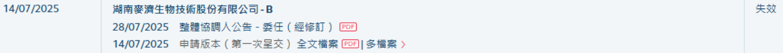 | | 28/07/2025 整體協調人公告 - 委任(經修訂) 『四 | | --- | --- | | 14/07/2025 | 湖南麥濟生物技術股份有限公司-B 14/07/2025 申請版本(第一次呈交) 全文檔案 □□ 多檔案) | 湖南麦济生物技术股份有限公司-B(简称:麦济生物)于2025年7月14日所递交的港股招股书满6个月,于2026年1月14日失效,递表时中金为其独家保荐人。 招股书显示,麦济生物是一家处于注册临床阶段的生物制药公司,专注于发现、开发及商业化创新生物制剂,以解决有关过敏性及自身免疫疾病以及其他炎 症与免疫性疾病方面尚未满足的医疗需求。自2016年成立以来,公司已自主研发并建立一条由八款创新候选产品组成的强大管线,包括核心产品MG-K10、 关键产品MG-014及MG-013,以及五款其他候选产品。所有该等产品均为通过公司自有技术平台发现及开发的新一代长效抗体。 ...
