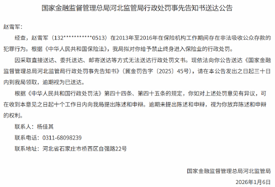 1月6日金融一线消息,国家金融监督管理总局河北监管局行政处罚事先告知书送达公告显示,赵雪军 (132***********0513)在2013年至2016年在保险机构工作期间存在非法吸收公众存款的犯罪行为。根 据《中华人民共和国保险法》,该局拟对赵雪军给予禁止终身进入保险业的行政处罚。 责任编辑:李琳琳 1月6日金融一线消息,国家金融监督管理总局河北监管局行政处罚事先告知书送达公告显示,赵雪军 (132***********0513)在2013年至2016年在保险机构工作期间存在非法吸收公众存款的犯罪行为。根 据《中华人民共和国保险法》,该局拟对赵雪军给予禁止终身进入保险业的行政处罚。 责任编辑:李琳琳 ...