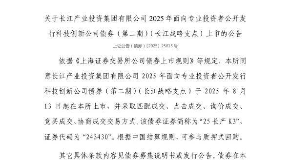 8月12日,上交所发布关于长江产业投资集团有限公司2025年面向专业投资者公开发行科技创新公司债 券(第二期)(长江战略支点)上市的公告。 依据《上海证券交易所公司债券上市规则》等规定,上交所同意长江产业投资集团有限公司2025年面向 专业投资者公开发行科技创新公司债券(第二期)(长江战略支点)于2025年8月13日起在上交所上 市,并采取匹配成交、点击成交、询价成交、竞买成交、协商成交交易方式。该债券证券简称为"25长 产K3",证券代码为"243430"。根据中国结算规则,可参与质押式回购。 来源:金融界 ...