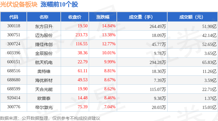 证券之星消息,1月12日光伏设备板块较上一交易日上涨2.26%,东方日升领涨。当日上证指数报收于 4165.29,上涨1.09%。深证成指报收于14366.91,上涨1.75%。光伏设备板块个股涨跌见下表: | 代码 | 名称 | 主力净流入(元) | 主力净占比 游资净流入 (元) | | 游资净占比 散户净流入 (元) | | 散户净占比 | | --- | --- | --- | --- | --- | --- | --- | --- | | 600151 | 航天机电 | 8.84 Z | 13.43% | -4.56 Z | -6.93% | -4.28 Z | -6.50% | | 601012 隆基绿能 | | 4.96 Z | 7.16% | -2.81亿 | -4.06% | -2.15 Z | -3.10% | | 300118 | 东方日升 | 3.72 Z | 7.18% | -2.17 乙 | -4.18% | -1.55 Z | -2.99% | | 300316 晶盛机电 | | 2.50 乙 | 11.84% | -1.38亿 | -6.53% | -1.12 Z | -5.3 ...