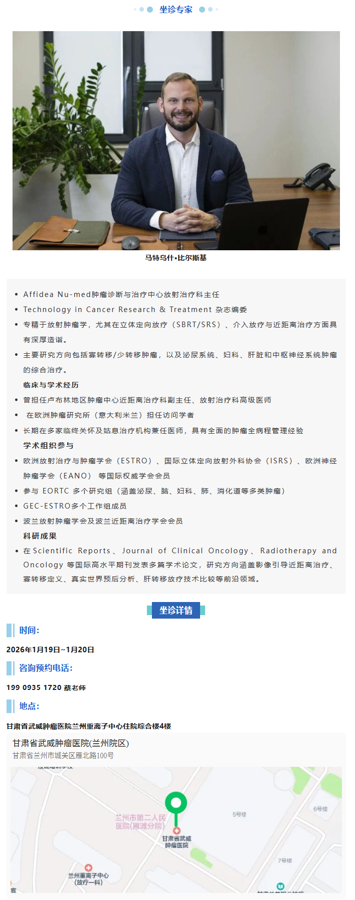 兰州重离子中心特邀波兰著名放射肿瘤学专家马特乌什·比尔斯基(Mateusz Bilski)教授来院开展临床 诊疗与学术指导,以国际前沿水准赋能区域肿瘤诊疗升级。 1月19日-20日期间,马特乌什·比尔斯基教授将开展特需门诊服务,为患者提供国际水准的个性化诊疗 方案,让患者足不出境享欧洲顶尖肿瘤放疗专家的精准诊疗。 精准诊疗,赋能健康。目前,教授特需门诊已开放预约,欢迎有需求的患者抓紧预约,把握与国际顶尖 专家面对面咨询的宝贵机会! 199 0935 1720 蔡老师 地点: 甘肃省武威肿瘤医院兰州重离子中心住院综合楼4楼 甘肃省武威肿瘤医院(兰州院区) 甘肃省兰州市城关区雁北路100号 6号楼 5号樓 7日报 责任编辑:李靓 字不组织梦与 坐诊详情 时间: 2026年1月19日~1月20日 咨询预约电话: ● 欧洲放射治疗与肿瘤学会 (ESTRO)、国际立体定向放射外科协会 (ISRS)、欧洲神经 肿瘤学会(EANO) 等国际权威学会会员 ● 参与 EORTC 多个研究组(涵盖泌尿、脑、妇科、肺、消化道等多类肿瘤) · GEC-ESTRO多个工作组成员 · 波兰放射肿瘤学会及波兰近距离治疗学会会员 科研成果 ...