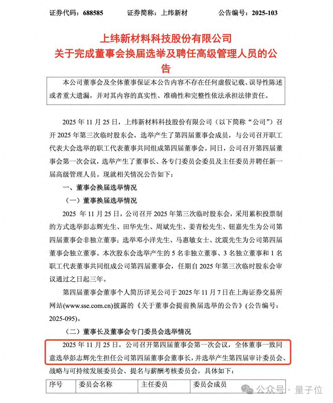 33岁,A股上市公司董事长!B站百大up主"稚晖君",又更上了一层楼。 11月25日, 上纬新材公告重磅落地:选举 彭志辉为第四届董事会董事长,任期与第四届董事会同步。 在各行各业的董事长们纷纷亲自出马、抛头露面争当 "网红" 时,自带280万+粉丝的B站顶流UP主 稚晖君,成了"A股具身智能第一股"董事长。 而"稚晖君"彭志辉的人生也宛如坐上了火箭。 2018年电子科技大学硕士研究生毕业,2019年开始在B站为人所知。 2020年以"天才少年"计划入职华为,2023年创业具身智能机器人…… 2025年成为了A股上市公司董事长。 7年时间,如今也才33岁的稚晖君,不可思议。 "稚晖君",又有新职务! 11月25日晚间,上纬新材发布公告称,公司召开第三次临时董事会,选举产生了第四届董事会成员。 同日,第四届董事会召开第一次会议,选举 彭志辉为第四届董事会董事长,任期至第四届董事会任期届满之日止。 据公告,以稚晖君为代表的第四届董事任期为三年(自11月25日起),直到届满之日止。 上纬新材官网的董事会管理层信息也同步更新了信息。 除稚晖君担任董事长以外,公告显示 田华担任公司首席执行官(总经理、CEO)及法定代表 ...