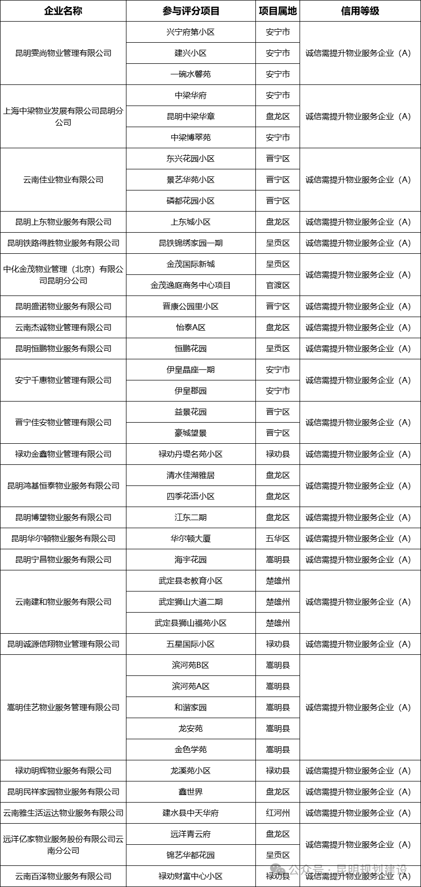 其中,达到"4A"标准的优秀物业服务企业有30家,"A级"诚信需提升物业服务企业有73家。 按照《云南省物业服务企业信用评价管理办法(修订版)》以及《云南省住房和城乡建设厅关于开展2024年度全省物 业服务企业信用评价工作的通知》要求,昆明市物业服务企业以物业服务项目为评价单位,向项目所在地的县(市) 区住房城乡建设部门进行申报。 根据物业服务企业自主申报情况,经各县(市)区住房城乡建设部门对辖区内住宅小区物业服务企业信用信息进行采 集、确认、计分,由昆明市住房和城乡建设局对属地登记企业的综合统计得分进行确认后,经公示,最终形成2024年 度昆明市住宅小区物业服务企业"4A"及以下等级信用评价结果。 近日,昆明市住房和城乡建设局发布《关于公布2024年度昆明市住宅小区物业服务企业"4A"及以下等级信用评价结果 的通知》,公布354家物业企业的信用评价结果,涉及1085个小区。 | 晋宁佳安物业管理有限公司 | | | 诚信需提升物业服务企业(A) | | --- | --- | --- | --- | | | 豪城望景 | 晋宁区 | | | 禄劝金鑫物业管理有限公司 | 禄劝丹堤名苑小区 | 禄劝县 | 诚 ...