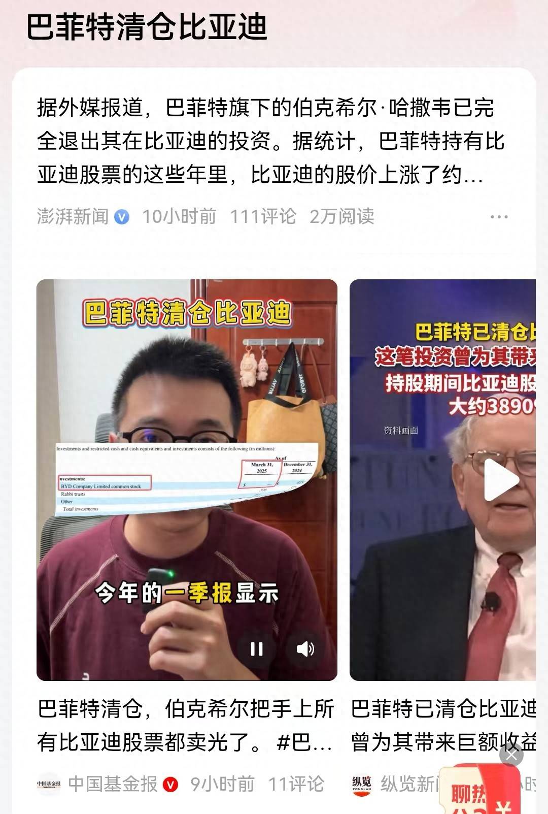 Core Viewpoint - The recent news about Warren Buffett's divestment from BYD has sparked discussions regarding the reasons behind this decision, suggesting it may not indicate a lack of investment value in BYD but rather a shift in Buffett's investment focus away from domestic markets [1] Investment Background - Buffett's investment in BYD was primarily influenced by Charlie Munger, who was recommended the company by Chinese investor Li Lu, highlighting the collaborative nature of the investment decision [4] - In 2008, Buffett purchased 225 million shares of BYD at HKD 8 per share, which represented approximately 20% of the company, resulting in a return of nearly 39 times the initial investment by the time of his divestment [6][8] Performance Comparison - Li Lu's investment in BYD began in 2002, and at its peak, he held 7.03% of BYD's H-shares, with his investment growing from over 200 million to more than 10 billion, yielding a return of over 70 times [8] - As of 2025, Buffett's stake in BYD is expected to fall below 5%, leading to speculation that he may have completely exited the position, reflecting a broader trend of reducing exposure to non-U.S. investments [8][11] Investment Philosophy - Buffett's investment strategy is characterized by a conservative approach towards new technologies and high-growth sectors, preferring traditional companies and maintaining a significant cash position in his portfolio [10][13] - His reluctance to invest in companies like Tesla underscores his cautious stance on the volatility and unpredictability associated with tech investments [10] Future Outlook - Buffett's preference for U.S. companies aligns with his long-term investment philosophy, emphasizing stability and predictability, especially as he approaches 90 years of age [11] - The decision to divest from BYD should not be interpreted as a negative assessment of the company but rather as a reflection of Buffett's evolving investment strategy and focus [12]