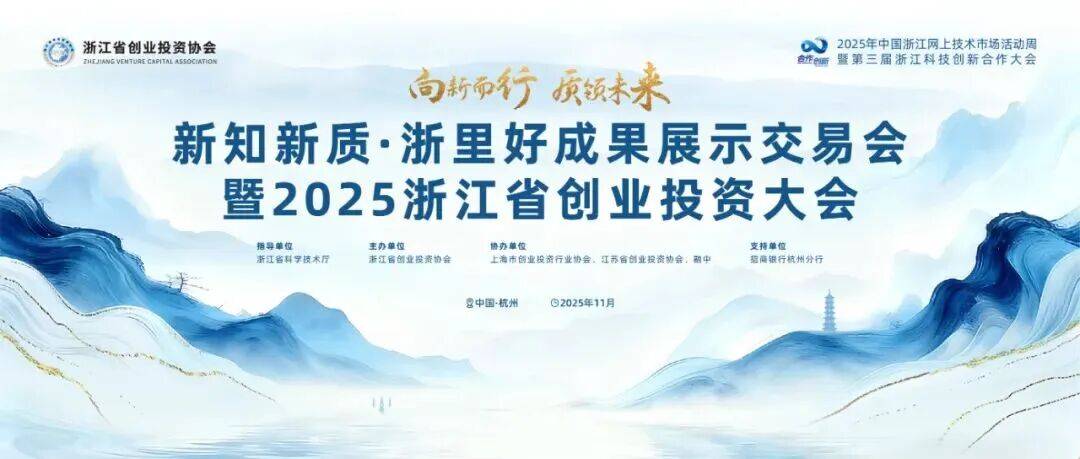 11月27日-云栖小镇国际会展中心 为落实创新驱动发展战略,推动创业投资发展,服务科技型中小企业,促进科技成果产业化,根据2025中国浙江网上技术市场活动周总体部署,将于2025 年11月27日,在杭州举办"新知新质·浙里好成果展示交易会暨2025浙江省创业投资大会"。 具体会议事项通知如下: 各有关单位: 向新而行 质领未来 指导单位: 浙江省科学技术厅 主办单位: 浙江省创业投资协会 协办单位: 上海市创业投资行业协会 支持单位: 招商银行杭州分行 时间: 2025年11月27日(周四) 地点: 杭州云栖小镇国际会展中心 8:30-8:50 华云厅签到 8:50-10:50 硬科技专场项目路演 江苏省创业投资协会 融中 10:50-12:00 投融资互动交流、展区参观 12:00-13:00 工作午餐 ▶ 新知新质·浙里好成果展示交易会(硬科技专场项目路演) 11月27日上午8:30-12:00 杭州云栖小镇国际会展中心华云厅 13:30-14:00 云栖厅签到 14:00-14:10 致辞:浙江省科学技术厅领导 14:10-14:40 14:40-14:45 启动仪式 14:45-15:15 主题演讲一 ...