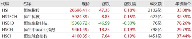 Group 1 - The Hang Seng Index closed up 0.18% at 26,696.41 points, while the Hang Seng Tech Index rose 0.15% to 5,924.39 points [2] - The year-to-date performance of the Hang Seng Index is up 33.08%, and the Hang Seng Tech Index has increased by 32.59% [2] - Consumer sectors, particularly retail and dining, showed strong activity, with notable gains in stocks such as Huada Hotel, which rose over 8%, and other companies like Yum China, Samsonite, and Chow Tai Fook also saw increases [2] Group 2 - Xpeng Motors experienced a significant increase, closing nearly 18% higher at HKD 108.5 per share, bringing its total market capitalization to HKD 207.2 billion [3]