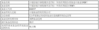 | 故食名称 | 中城运营手禄稳健养老目标一年特有限配合型基金中基金(FOF) | | --- | --- | | 基金简称 | 中製添植 禄稳健养老目标一年持有明泥合(FOF) | | 本会主代理 | 010217 | | 甚全管理人名称 | 中製基金管理有限公司 | | 公告依据 | 所以及前往開發的社會出版社會會出版社人。 | | 基金经理专更资型 | 图聘基金经理 | | 副任基金经理姓名 | 隐浮 | | 共同管理本基金的其他基金 就卫威 | | | 副手基金经理姓名 | 标准 | | | | | --- | --- | --- | --- | --- | | 【国用期 | 2025年8月1日 | | | | | 证券及收费用 | 0 | | | | | 证券投资管理从业年代 | 0 | | | | | | | | 2017年加入中银基金管理有限公司。曾任研究员、基金经理助理、专户投资经 | | | 过往从业经历 | 4 基金主代引 | 基金名称 | 在职日期 | 图在日期 | | | 016086 | 中银慧泽积极3个 具持有用混合型 | 2024-8-16 | | | | | 发起式墙金中装 | ...