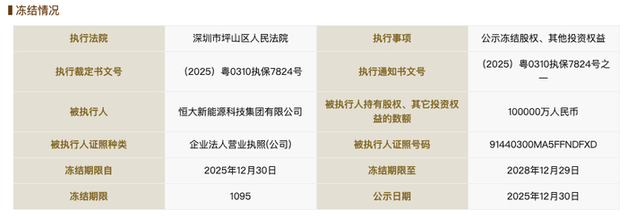 | 执行法院 | 深圳市坪山区人民法院 | 执行事项 | 公示冻结股权、其他投资权益 | | --- | --- | --- | --- | | 执行裁定书文号 | (2025) 粤0310执保7824号 | 执行通知书文号 | (2025) 粤0310执保7824号之 | | 被执行人 | 恒大新能源科技集团有限公司 | 被执行人持有股权、其它投资权 益的數额 | 100000万人民币 | | 被执行人证照种类 | 企业法人营业执照(公司) | 被执行人证照号码 | 91440300MA5FFNDFXD | | 冻结期限自 | 2025年12月30日 | 冻结期限至 | 2028年12月29日 | | 冻结期限 | 1095 | 公示日期 | 2025年12月30日 | 国家企业信用信息公示系统网站显示,2025年12月30日,恒大新能源科技集团有限公司新增一则股权冻 结信息,股权所在企业为恒大新能源科技管理(深圳)有限公司,冻结股权数额10亿人民币,冻结期限 为3年,执行法院为深圳市坪山区人民法院。 天眼查App显示,恒大新能源科技集团有限公司成立于2019年1月,法定代表人为李林林,注册资本10 亿美元 ...