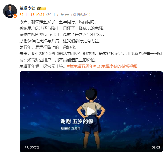 荣耀5周年,CEO李健发文致谢