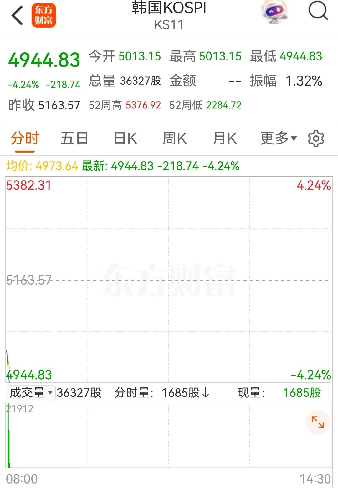 每经记者|黄胜 每经编辑|金冥羽 记者|黄胜 编辑|金冥羽 杜波 校对|许绍航 2月6日,日韩股市低开,开盘后直线下挫。截至发稿,日经225指数跌超1%,韩国KOSPI指数跌超4%。 4944.83 今开5013.15 最高 5013.15 最低 4944.83 振幅 1.32% -4.24% -218.74 总量 36327股 金额 -- 昨收 5163.57 52周高 5376.92 52周低 2284.72 更多▼ [0] 分时 五日 均价: 4973.64 最新: 4944.83 -218.74 -4.24% | 5382.31 | | | 4.24% | | --- | --- | --- | --- | | 5-1-63.57 | | | | | 4944.83 成交量▼ 36327股 | 分时量: 1685股↓ | 现量: | -4.24% 1685股 | | 21912 | | | V | 08:00 14:30 KS11 韩国KOSPI 200指数期货下跌5%,程序化交易暂停5分钟。 韩国KOSPI (免责声明:本文内容与数据仅供参考,不构成投资建议,使用前请核实。据此操作,风险自担。) ...