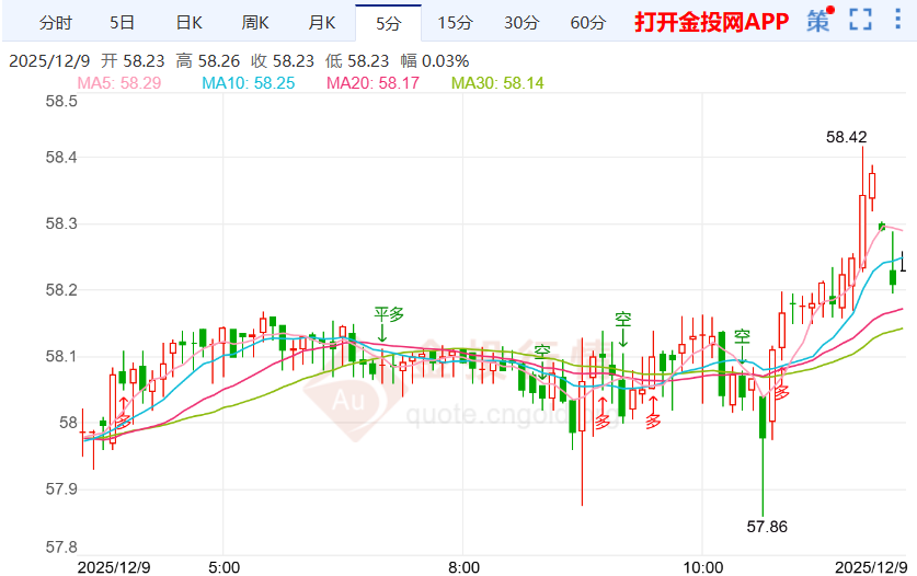因此,尽管本周可能降息,美联储或将刻意保持措辞开放,为1月根据经济数据(尤其是劳动力市场动态)保留进一步宽 松的空间。 【最新国际白银行情解析】 今日周二(12月9日)亚盘时段,国际白银目前交投于58.18一线上方,今日开盘于58.13美元/盎司,截至发稿,国际白银 暂报58.25美元/盎司,上涨0.24%,最高触及58.42美元/盎司,最低下探57.86美元/盎司,目前来看,国际白银盘内短线 偏向看跌走势。 【要闻速递】 许多投资者预计,美联储本周在降息的同时将释放偏鹰的前瞻指引,反映出FOMC内部对是否应继续降息存在分歧。 然而,高盛首席美国经济学家David Mericle认为,美联储很可能不会完全排除明年1月再次行动的可能性。"指望FOMC 通过强烈暗示'1月将暂停降息'而把自己逼入死角是不现实的,因为如果到那时劳动力市场仍在明显走弱,降息仍可能 是合适的。" 他指出,自9月就业数据发布以来,官方尚未公布新的劳动力市场统计,这使得票委们在本周会议中更不愿过早锁定1 月政策路径。"在缺乏最新就业数据的情况下,决策者会格外谨慎,避免束缚自己的政策灵活性。" 国际白银已连续六个交易日在56.19至59.34 ...
