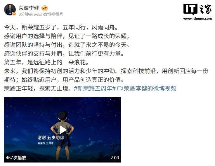 荣耀CEO李健发文庆祝新荣耀5周年:感谢用户、团队与伙伴